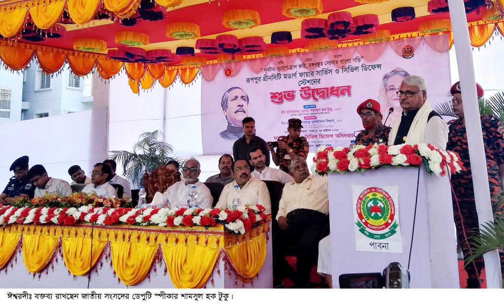ঈশ্বরদীর রূপপুরে মর্ডান ফায়ার সার্ভিস স্টেশনের উদ্বোধনী অনুষ্ঠানে প্রধান অতিথির বক্তব্যে জাতীয় সংসদের ডেপুটি স্পিকার অ্যাডভোকেট শামসুল হক টুকু এমপি বলেছেন, দেশের সকল ক্ষেত্রে ডিজিটালাইজেশনের ধারাবাহিকতায় ফায়ার সার্ভিস ও সিভিল ডিফেন্সের সেবার ত্রেগুলোকেও ডিজিটাল সুবিধার আওতায় আনা হচ্ছে। সরকারের বিভিন্ন উন্নয়ন কার্যক্রমের চিত্র তুলে ধরে তিনি আরও বলেন, মাননীয় প্রধানমন্ত্রীর ঘোষণা অনুযায়ী আমাদের দেশ হবে স্মার্ট বাংলাদেশ। ডিজিটাল বাংলাদেশের পর স্মার্ট বাংলাদেশের মতো আধুনিক ও উন্নত পরিকল্পনা গ্রহন করা দেশরত্ন শেখ হাসিনার মতো দূরদৃষ্টিসম্পন্ন বিশ্বনেতার পইে সম্ভব। এই সিদ্ধান্ত বাস্তবায়নে দেশের সকল ক্ষেত্রে ডিজিটালাইজেশনের কাজ চলমান রয়েছে। যার মাধ্যমে সকলের জন্য সেবা গ্রহণ প্রক্রিয়াকে সহজ ও সুবিধাজনক করে দেয়াই আমাদের সরকারের অন্যতম অঙ্গীকার।