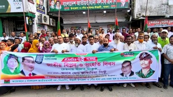 ঈশ্বরদীতে যথাযোগ্য মর্যাদায় ঐতিহাসিক ৭ নভেম্বর জাতীয় বিপ্লব ও সংহতি দিবস পালিত হয়েছে। দিবসটি পালন উপলক্ষে শুক্রবার (৭ নভেম্বর) সকালে ঈশ্বরদী রেলগেটস্থ উপজেলা ও পৌর বিএনপির কার্যালয়ের সামনে জাতীয় ও