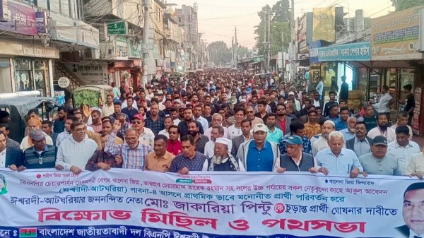 ত্রয়োদশ জাতীয় সংসদ নির্বাচনে পাবনা-৪ (ঈশ্বরদী–আটঘোড়িয়া) আসনের বিএনপি প্রার্থী পরিবর্তনের দাবিতে ঈশ্বরদীতে তৃণমূল নেতাকর্মীরা বিশাল বিক্ষোভ মিছিল ও সমাবেশ করেছেন। সোমবার (১৭ নভেম্বর) বিকেলে উপজেলার বিভিন্ন ইউনিয়ন ও পৌর এলাকার
