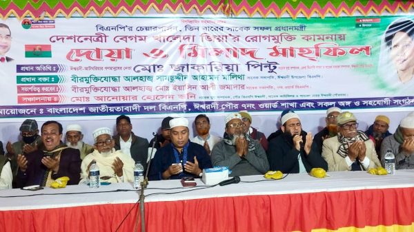 বিএনপির চেয়ারপার্সন ও তিনবারের সাবেক প্রধানমন্ত্রী বেগম খালেদা জিয়ার আশু রোগমুক্তি কামনায় ঈশ্বরদীতে দোয়া ও মাহফিল অনুষ্ঠিত হয়েছে। সোমবার (৮ ডিসেম্বর) সন্ধ্যা ৬টায় ঈশ্বরদী আমবাগান পুলিশ ফাঁড়ি মাঠে ঈশ্বরদী পৌরসভার