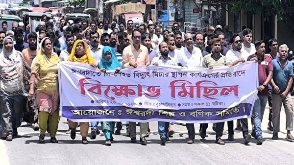 ঈশ্বরদীতে নর্দান ইলেকট্রিসিটি সাপ্লাই পিএলসি’র (নেসকো) গ্রাহকদের প্রিপেইড মিটার স্থাপন কার্যক্রমের প্রতিবাদে বিদ্যুৎ অফিস ঘেরাও, বিক্ষোভ ও মানববন্ধন করেছে ঈশ্বরদী শিল্প ও বণিক সমিতি। বৃহস্পতিবার (২৬ জুন) বেলা ১১টা থেকে
